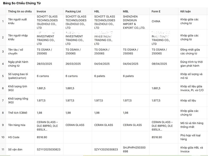 Đối chiếu thông tin giữa các file: số hợp đồng, ngày tháng, tên hàng, số lượng, giá trị, điều kiện giao hàng...